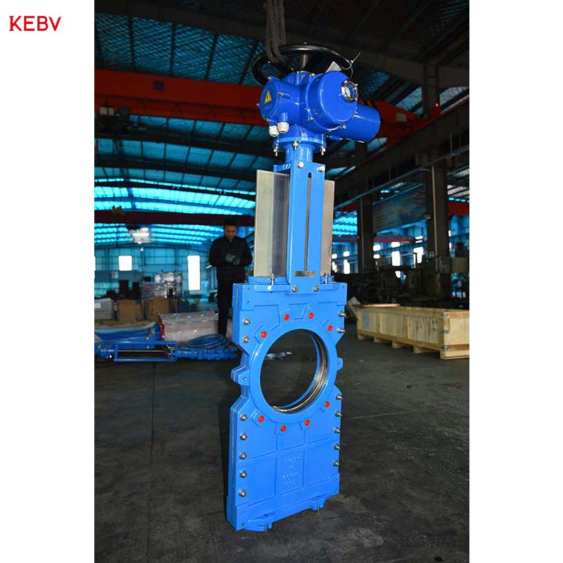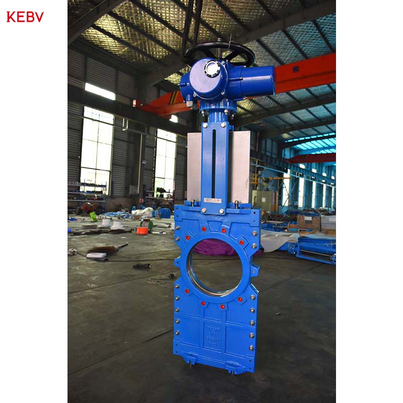 KEBV Through conduit knife gate valves are designed for two split bodies with double seat and for media with high consistency. The double seat design assures a non-clogging shut off on either normal or reverse flow. The gate slides through the full length of the body. When the valve is in open position, there are no dead corners in it and the valve becomes an extension of the pipe.